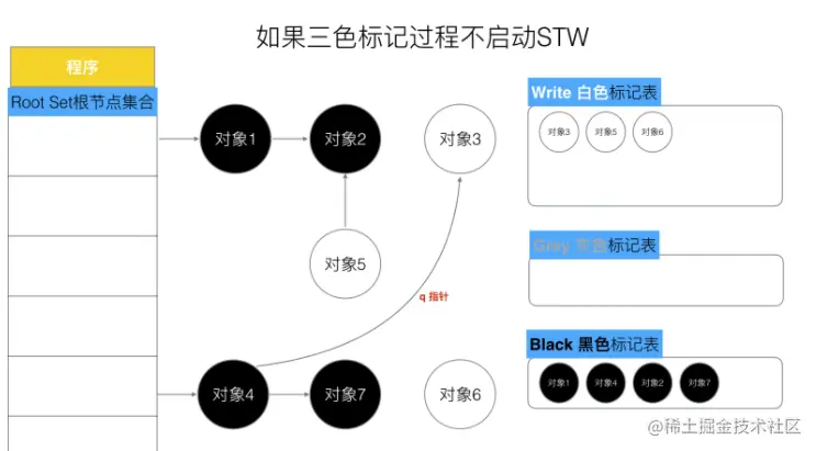 现在三色标记过程不启动STW,在GC扫描过程中,在任意的对象均可能发生读写操作,如下图,在没扫描对象二时,已经标记为黑色的对象4,此时创建了指针q,并且指向对象3。
