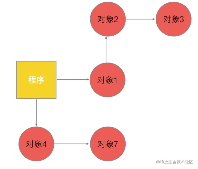 **第二步:**以程序为根节点来找出它可达的对象,并坐上标记