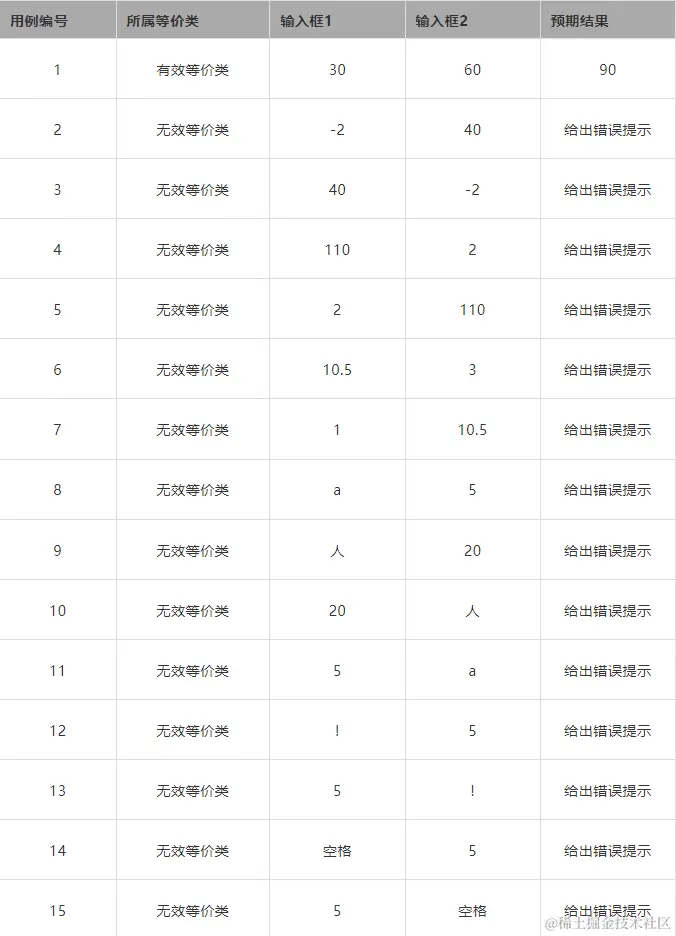 先编写一个很简单的用例,只包含最关键的一些信息,比如用例编号,属于的等价类,两个输入框中的测试数据,还有预期结果。