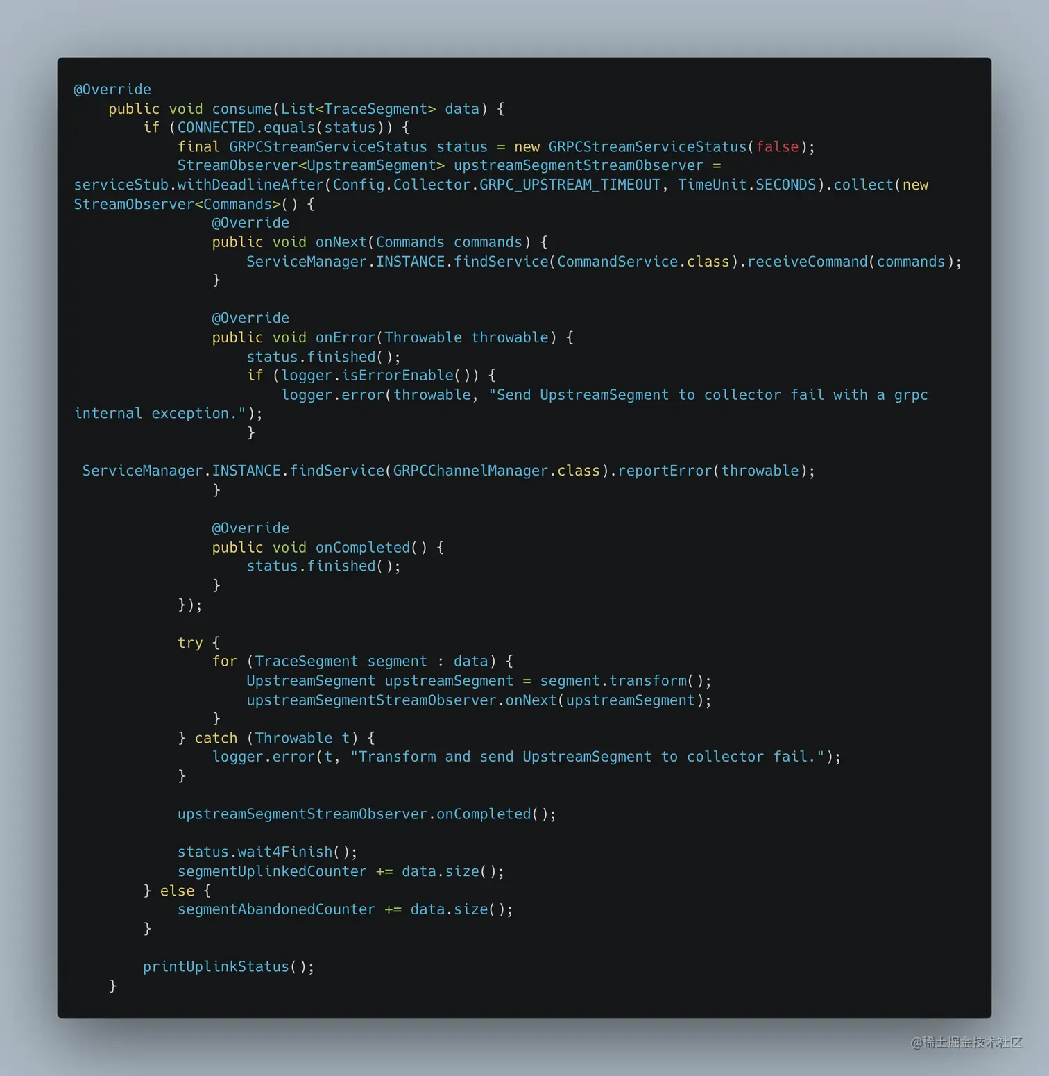 这篇文章主要将了Skywalking是如何进行收集Trace信息和发送Trace信息给OAP的,trace信息的收集其实是执行插件拦截器的afterMethod()的时候通知TracingContextListener的实现类执行afterFinished()方法,这里就调用了DataCarrier的produce()方法将trace信息放入到了缓存队列中,而trace信息的发送是TraceSegmentServiceClient的boot()中调用了DataCarrier的consume()方法创建ConsumerThread线程,执行ConsumerThread 的run()方法,run()中执行了TraceSegmentServiceClient的consume()方法来消费缓存队列中的trace信息,具体是将TraceSegment对象转换为UpstreamSegment对象,通过GRPC发送给Collector。