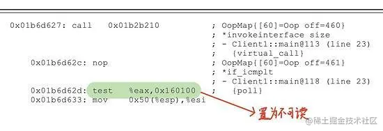 主动式中断比较简单,在安全点前面添加一个 test 汇编指令,当希望线程停下时,就通过 JVM 把 test 后面的地址设置为不可读,这样就可以触发线程产生自陷异常,被预先注册好的处理程序挂起。