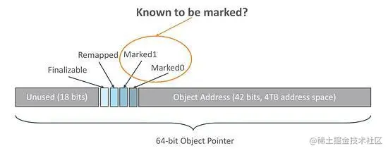 ZGC 的另一个标志性技术是 染色指针 。之前的三色标记法,看起来是标记对象,实则可以是标记引用,什么意思呢?