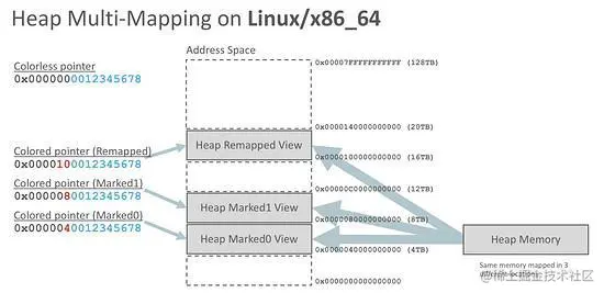 所以可以知道,如果后 m 位一致,那么多个虚拟地址会映射到同一个物理地址的。 详见 。所以 ZGC 利用这一点,把四个标志位不同的虚拟地址提前申请了,让它们都映射到同一个物理地址,解决了 OS 不支持的问题。