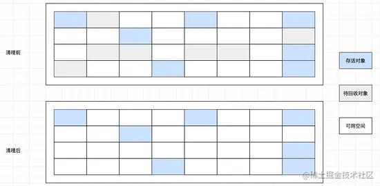 第二个是 碎片化问题 ,过多的碎片会导致没有足够大的空间分配对象进而触发进一步垃圾收集。