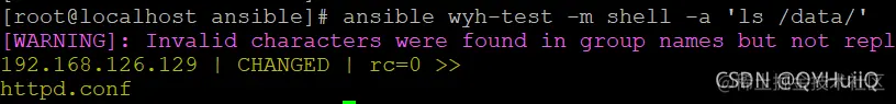 [root@localhost ansible]# ansible wyh-test -m shell -a 'ls /data'