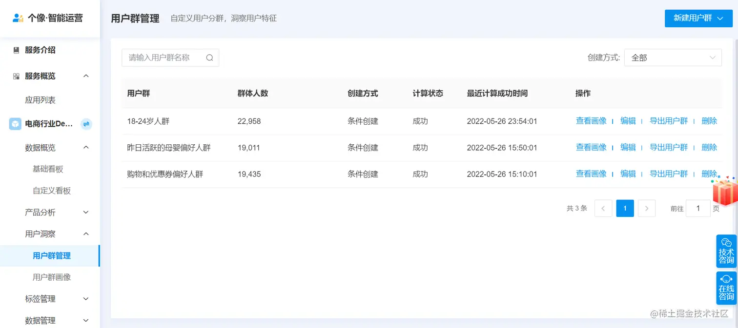 **①用户群管理:自定义用户分群,**圈选目标用户群