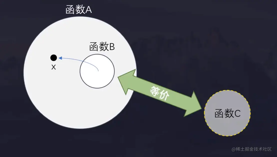 我们已知,函数 c() 就是函数 b() ,有由于函数 c() 是全局变量,因此,相当于在全局范围调用了函数 b() ,打破了函数 b() 只能在局部使用的限制,最终我们打印出了变量 x
