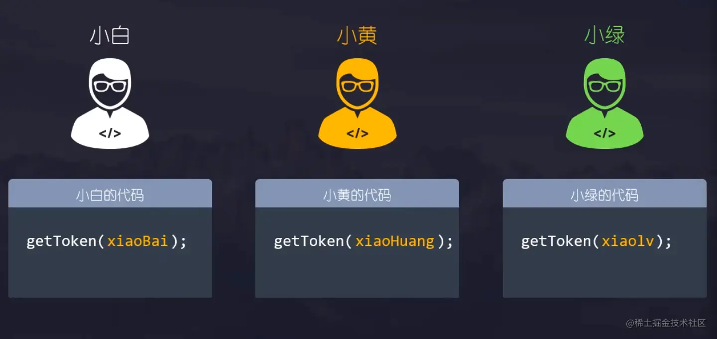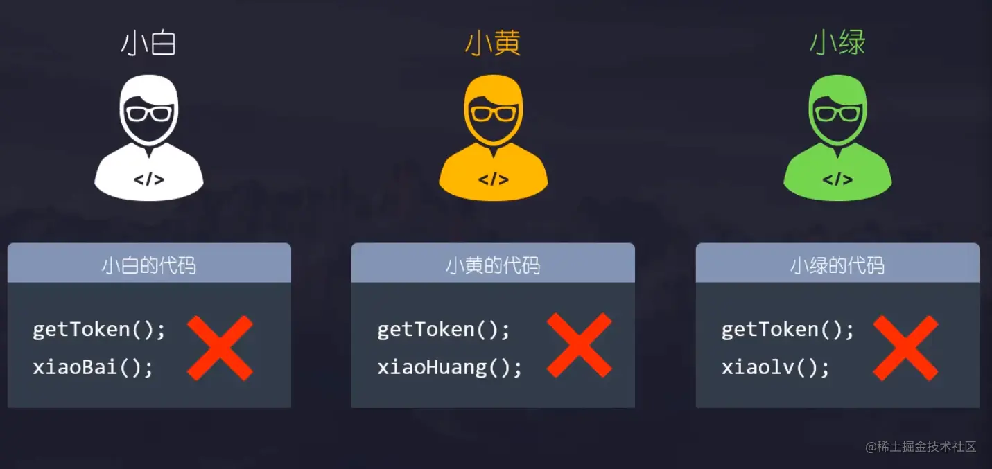假设有这样一个场景,项目组里有小白、小黄、小绿三个人,有一个工具函数 getToken()