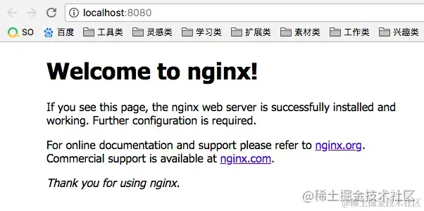 - 当你敲完nginx这5个键的时候,并没有任何反应,此时你只需访问localhost:8080(默认)即可