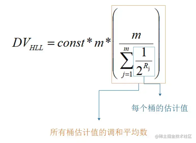 下面是 `HyperLogLog` 的结合了调和平均数的估算公式,变量释意和`LogLog`的一样: