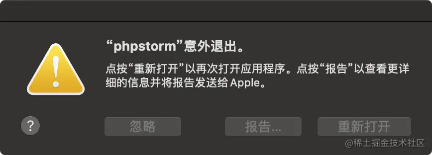 接下来在终端会输出IDE运行出错的信息,同时也会弹出上面截图的对话框。根据终端提示信息,可以知道本次软件运行的目录位于 /Users/你系统登录帐号的名字/Library/Application Support/JetBrains/