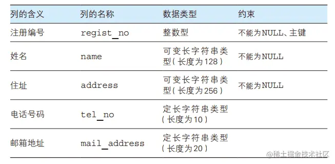 - 编写一条 CREATE TABLE 语句,用来创建一个包含表 1-A 中所列各项的表 Addressbook (地址簿),并为 regist_no (注册编号)列设置主键约束