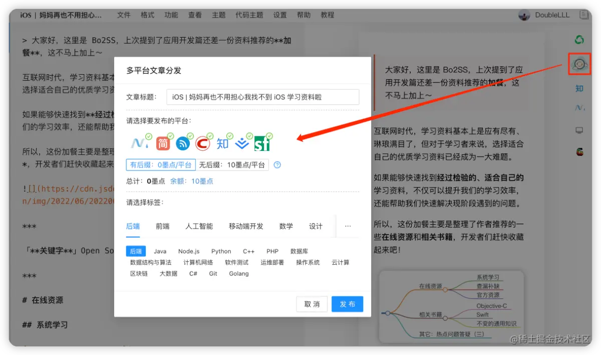 - 写好文章后,点击多平台发布按钮。