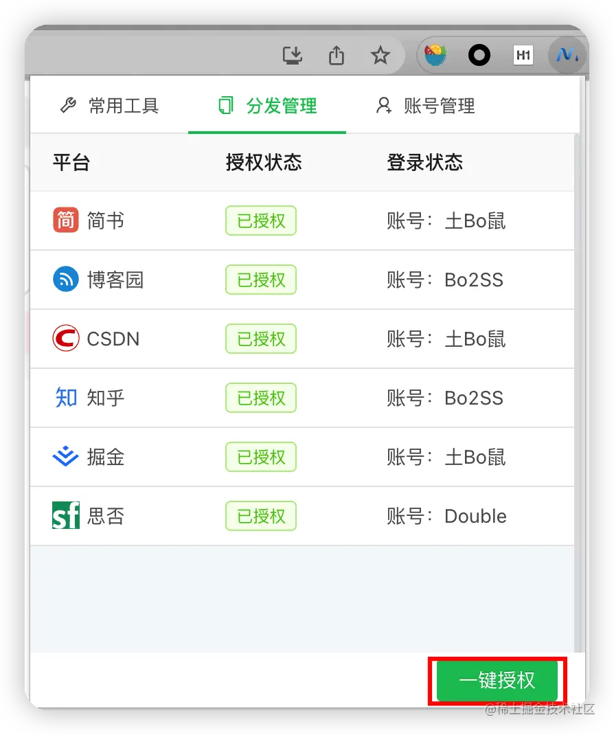 - 确保各平台已经登陆后,点击一键授权;