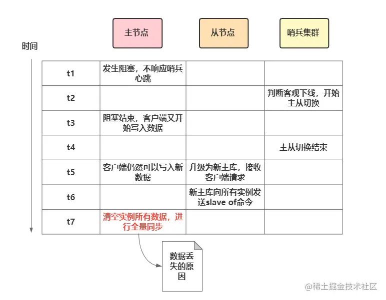 主节点卡住12s这时哨兵集群判断主节点下线,同时哨兵集群做主从切换需要5s,这就意味着主从切换过程中,主节点恢复运行,而min-slaves-max-lag设置为15s那么主节点还是可写,也就是说在12s~15s这期间如果有客户端写入原主节点,那么这段时间的数据会丢失。