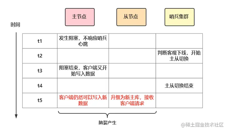 脑裂的主要原因其实就是哨兵集群认为主节点已经出现故障了,重新选举其它从节点作为主节点,而原主节点其实是假故障,从而导致短暂的出现两个主节点,那么在主从切换期间客户端一旦给原主节点发送命令,就会造成数据丢失。