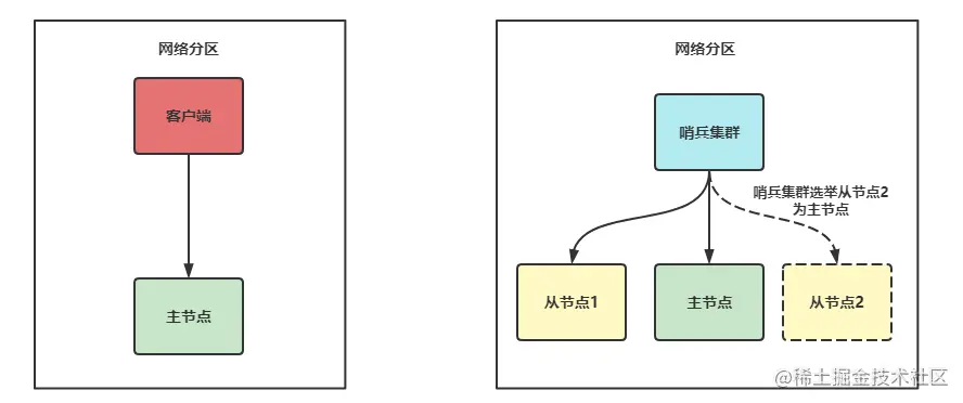 网络分区,主节点和客户端,哨兵和从库分割为了两个网络,主库和客户端处在一个网络中,从库和哨兵在另外一个网络中,此时哨兵也会发起主从切换,出现两个主节点的情况。