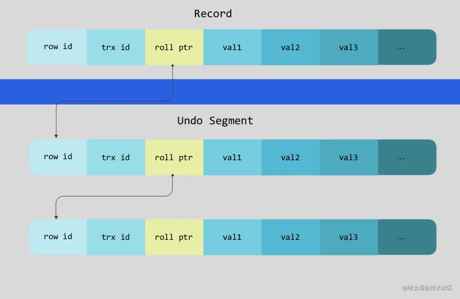 通过数据的roll ptr属性形成一个链表,便于查询上一个版本,使得读写互不阻塞。