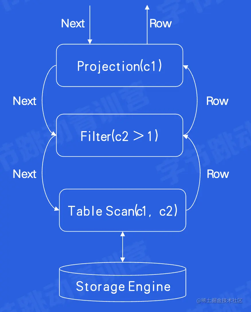 每个Operator调用Next操作,访问下层Opertor,获得下层Operator返回的一行数据。经过计算,返回结果给上一层。