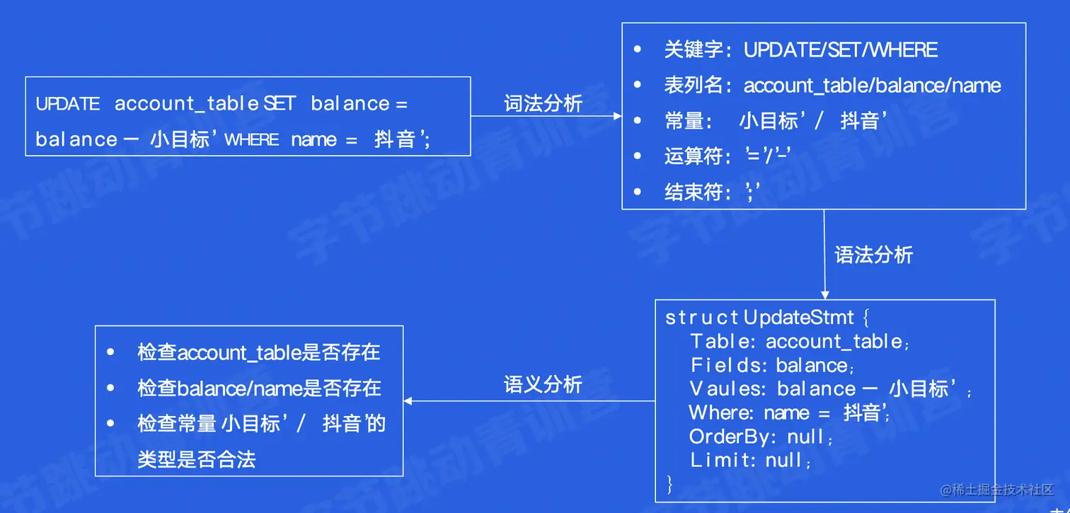 Parser语法解析器解析SQL,生成一个语法树AST,给到优化器生成Plan,告诉Executor执行器到底怎么执行,从文件中读写数据、写入日志。