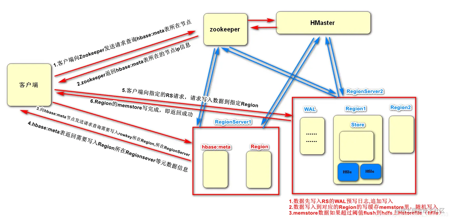 这个hbase:meta表或者说这个region也会存储在hbase节点上,具体存储在哪个节点上我们需要维护一下,这件事就是ZK干的(因为是region就可能因为RS的挂掉,负载均衡等移动位置。Hmaster在启动时会将hbase:meta表加载到ZK集群)。所以用户CRUD表时需要先去ZK上找到这个hbase:meta元数据表存在哪个节点上,然后在去跟这个节点通信,获取对应的元数据信息。如下图往hbase写一条数据ZK对元数据管理的作用