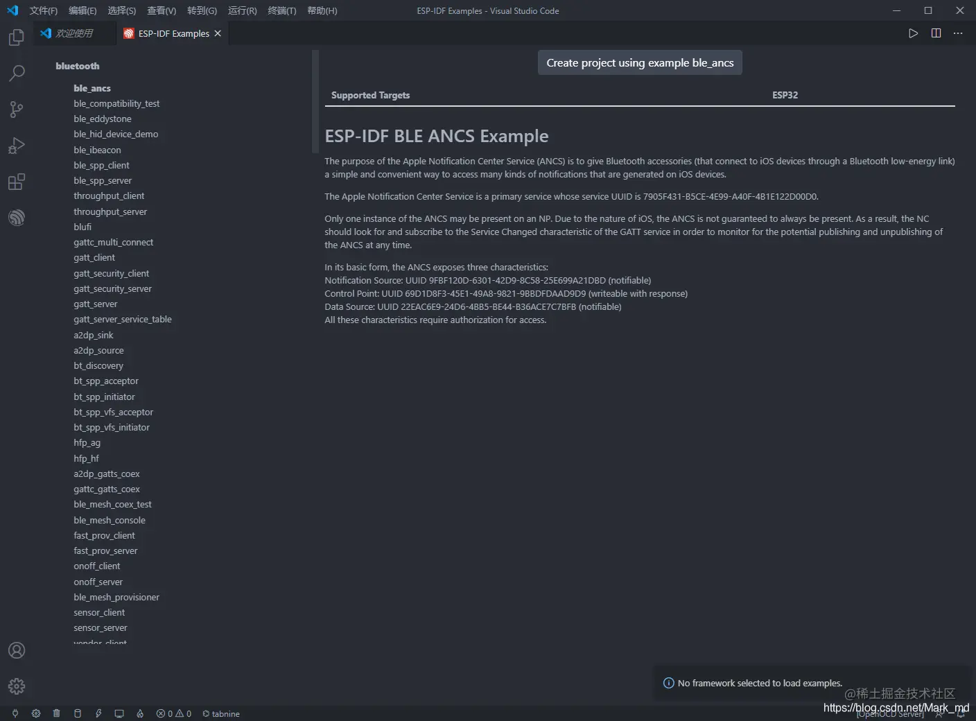 Use current ESP-ID,使用本地 SDK。 - 最终显示这样的界面。左侧是 SDK 中的 Demo 列表,右侧是 Demo 的功能描述。