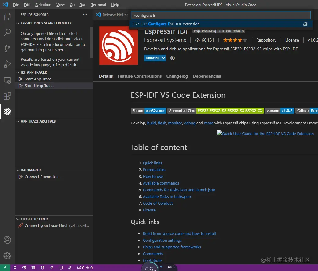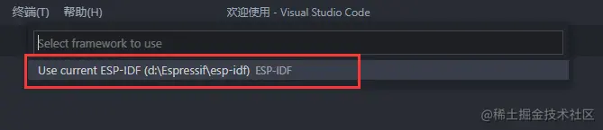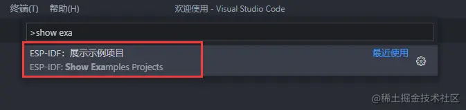 查看 - 命令面板(Ctrl+Shift+P)。输入configure esp-idf extension,点击。