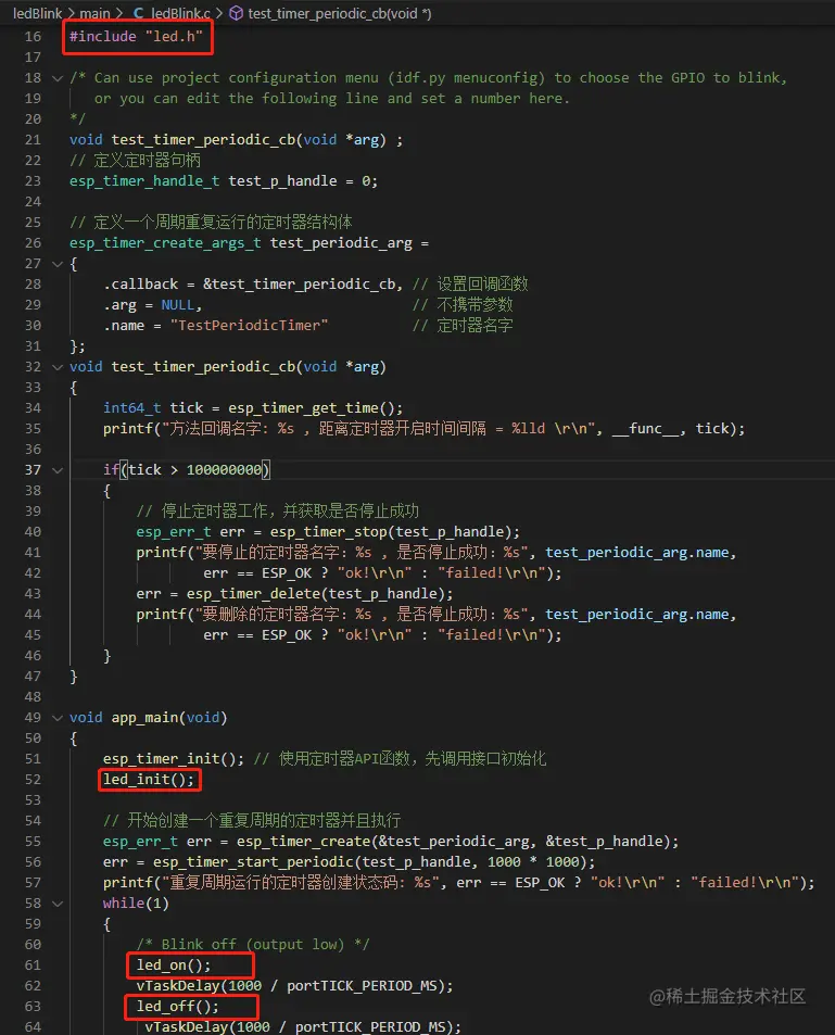 于是将原先 blink.c 中的 led 控制代码抽离剥出,单独编写外设驱动文件 components/led/src/led.c、components/led/include/led.h,并将 led-IO 初始化、亮、灭这些外设的操作,封装为函数,包含在驱动文件中。