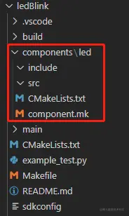 创建 components/led/src、components/led/include 这两个文件夹。复制 CMakeLists.txt、component.mk 到 components/led 下。工程目录结构如下: