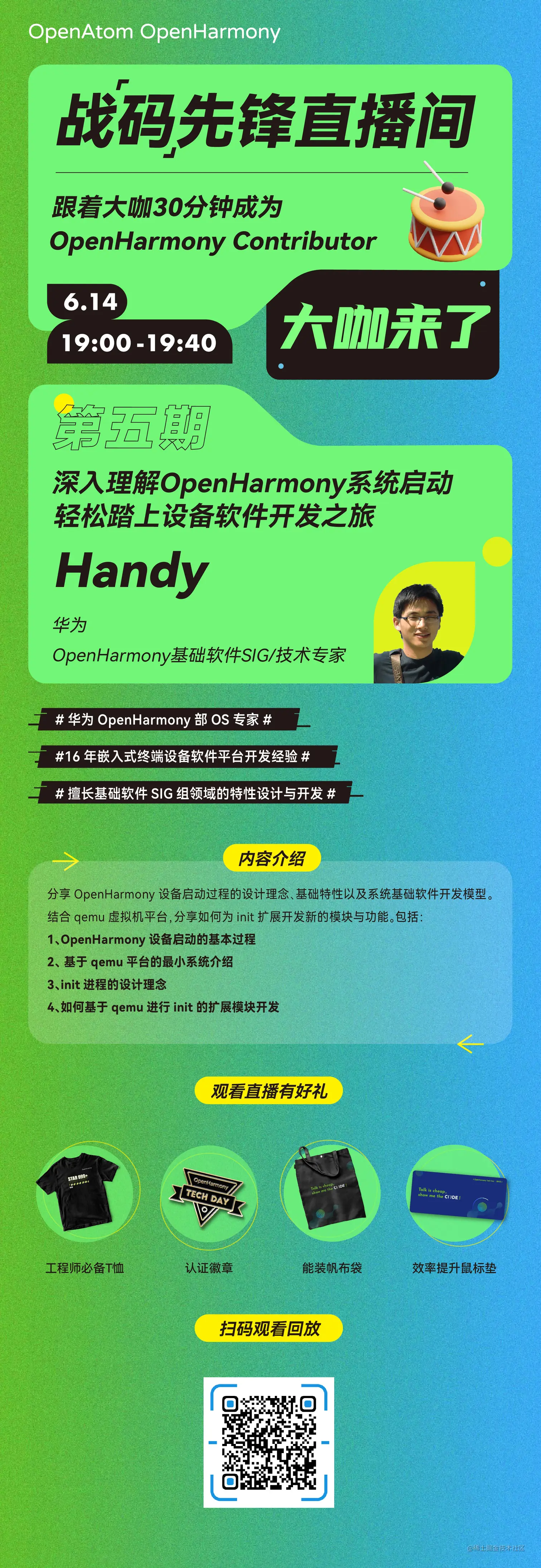第五期《深入理解OpenHarmony系统启动,轻松踏上设备软件开发之旅》直播中,Handy老师讲解了OpenHarmony设备启动过程的设计理念、基础特性以及系统基础软件开发模型。结合qemu虚拟机平台,分享如何为init扩展开发新的模块与功能,帮助开发者们由浅入深逐渐掌握技术知识。