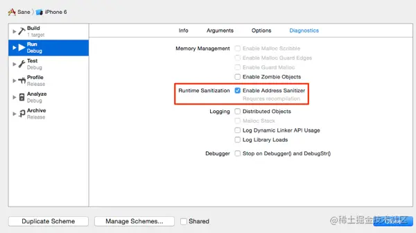 为了使用Address Sanitizer,你需要编辑方案(从 "Product "菜单中选择 "Scheme">"Edit Scheme...")。然后在 "运行 "命令中选择 "诊断 "标签并勾选 "启用地址消毒器 "选项。