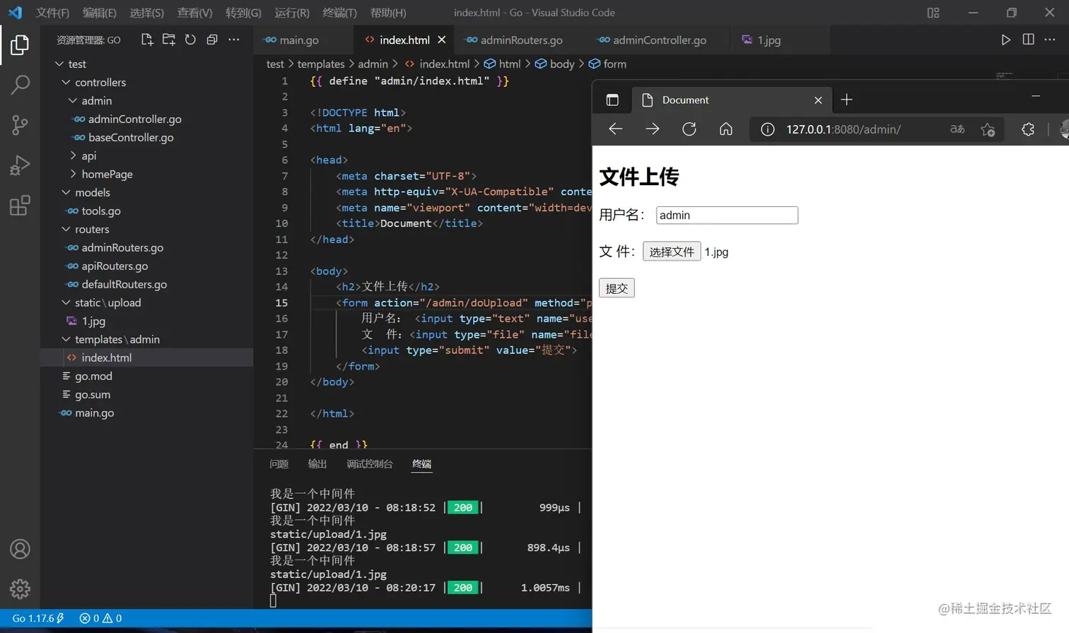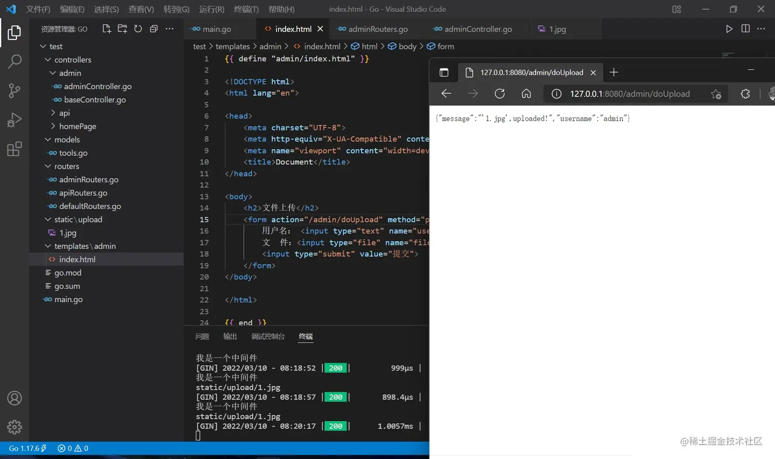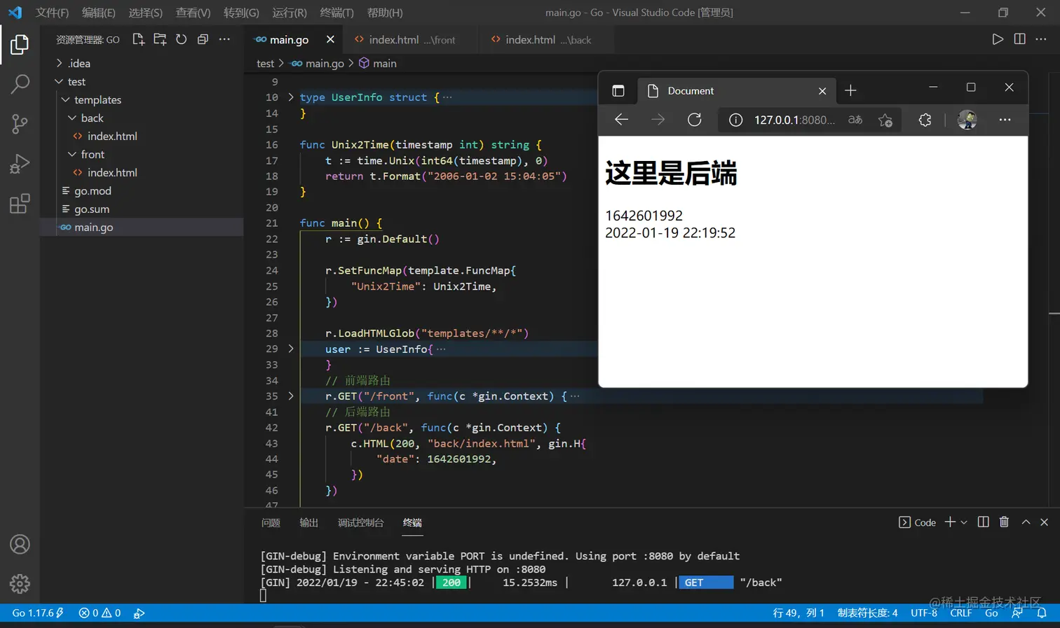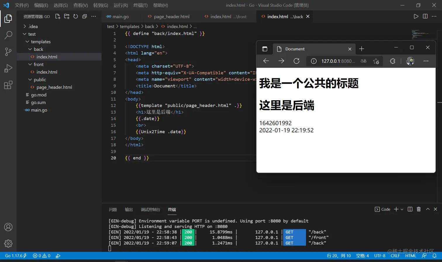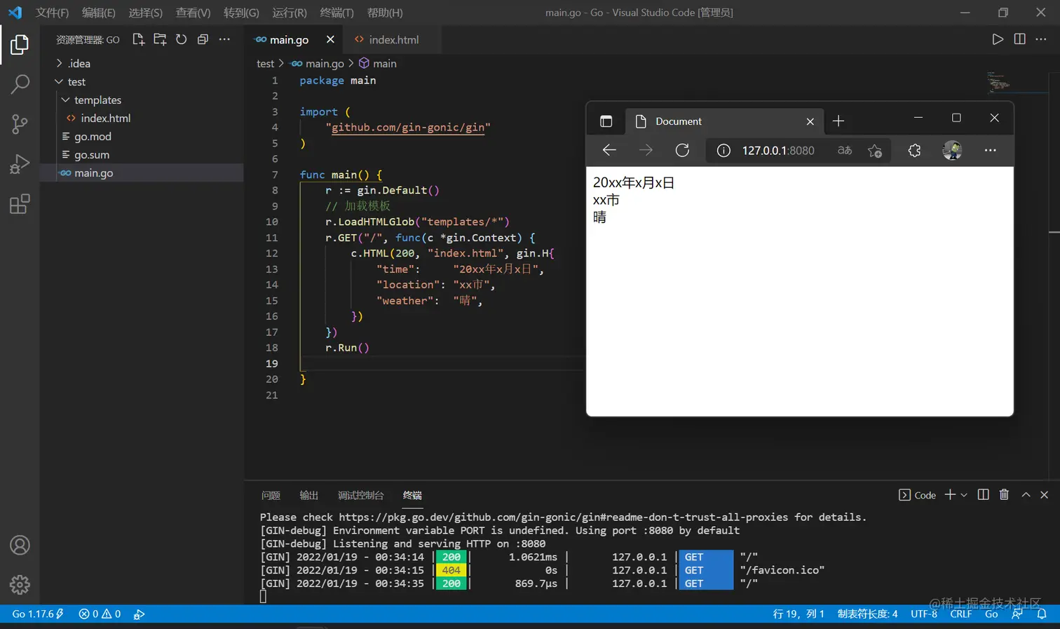 而 c.HTML() 是用于渲染模板的(下节详细讲),首先新建一个 templates 文件夹,在其中新建 index.html ,将代码复制进去