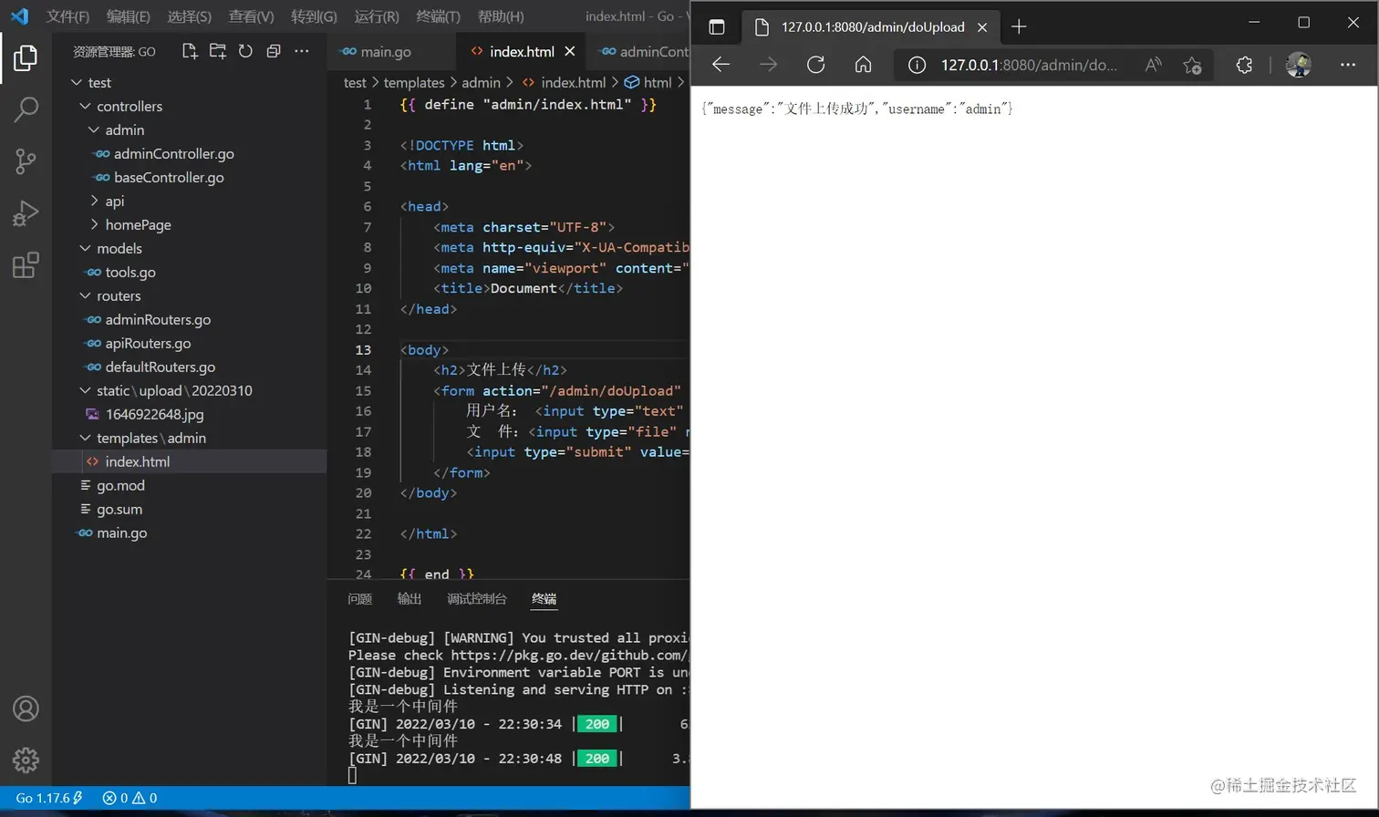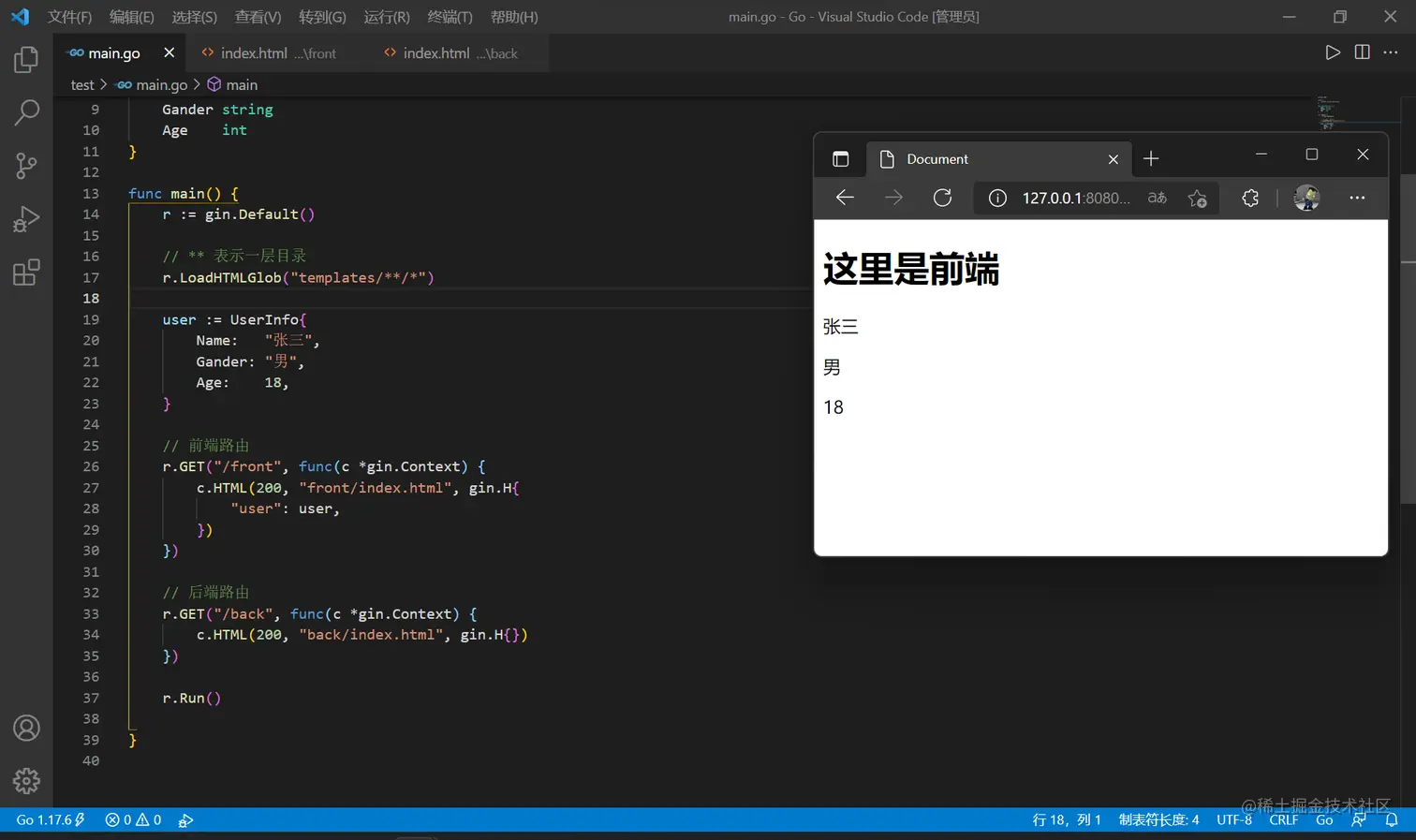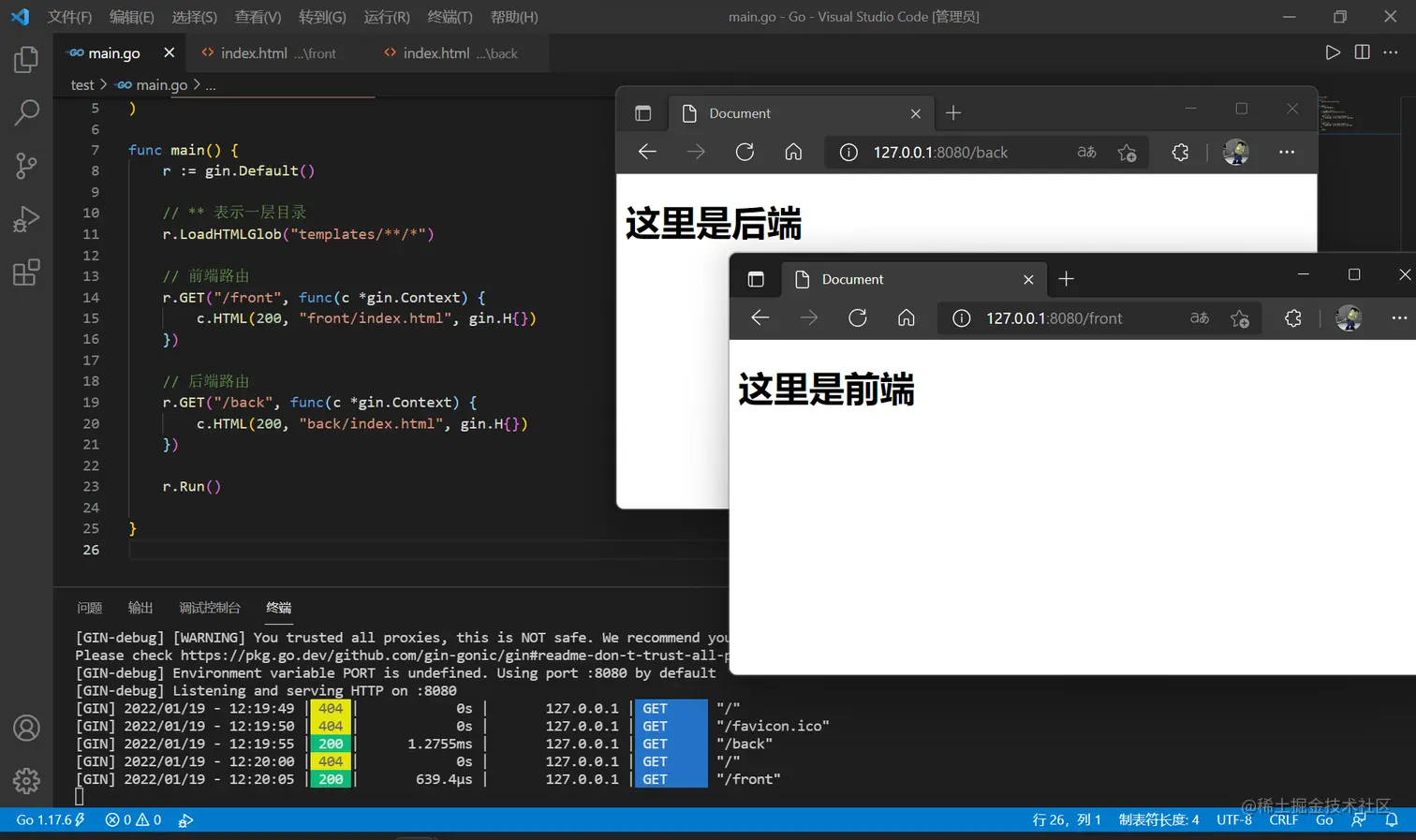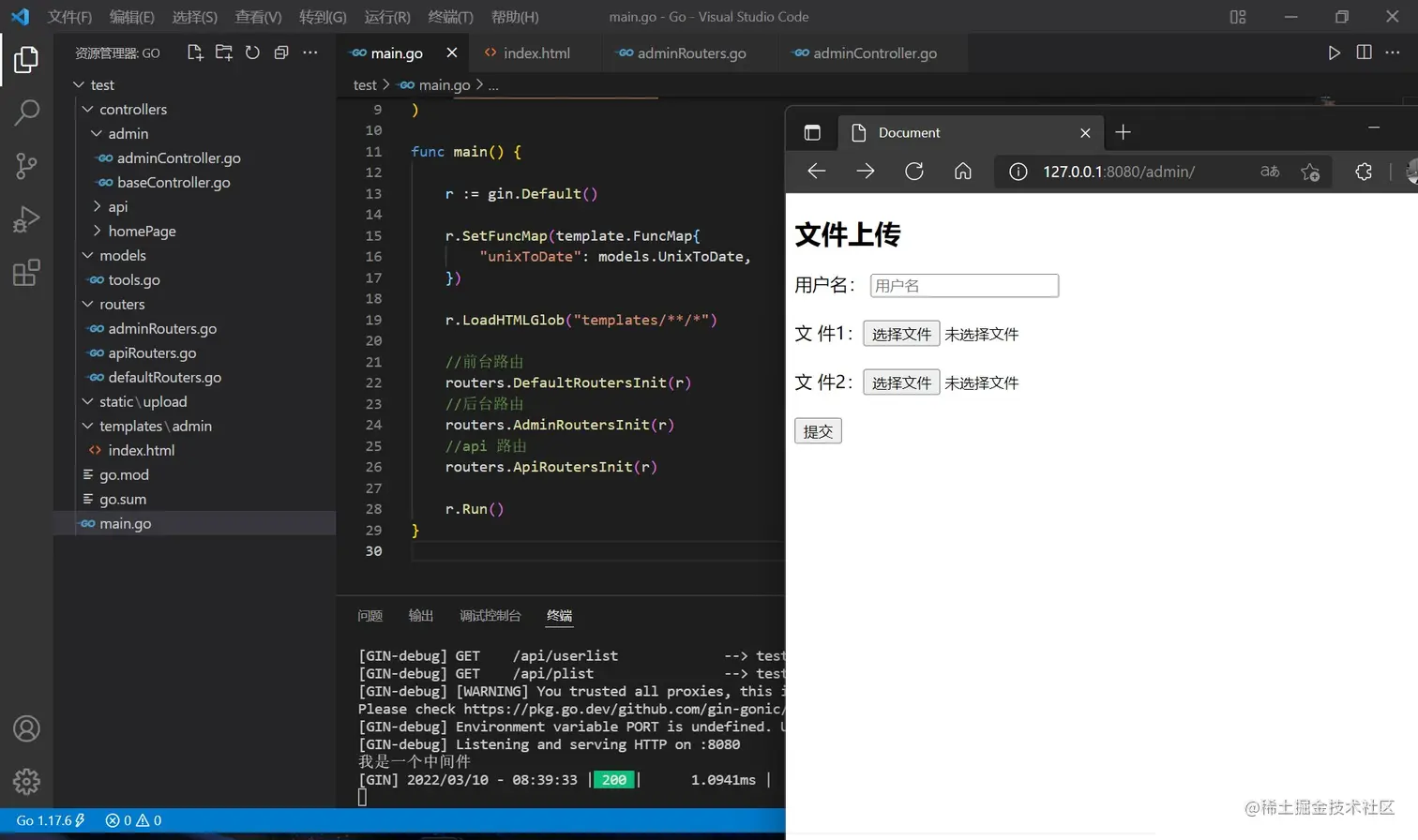 回到 main.go ,加载模板的语句要变化,使用两个星号表示一层目录,并分别配置前后端路由