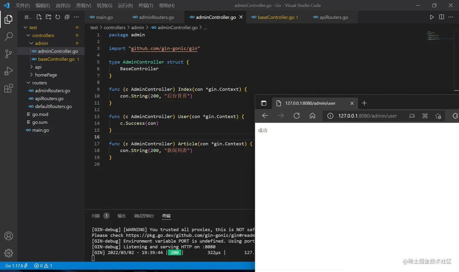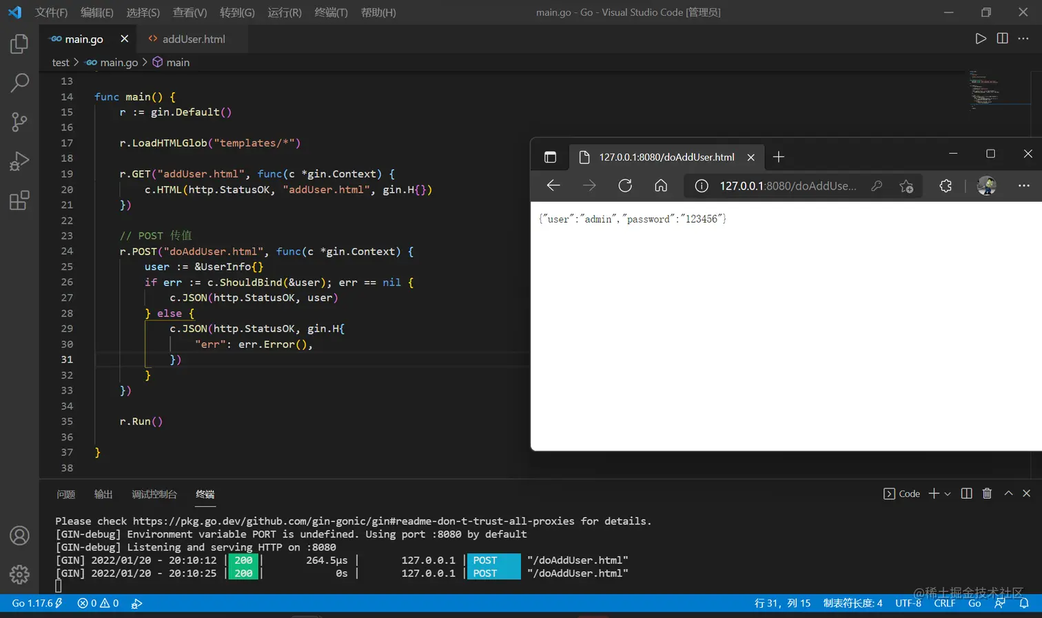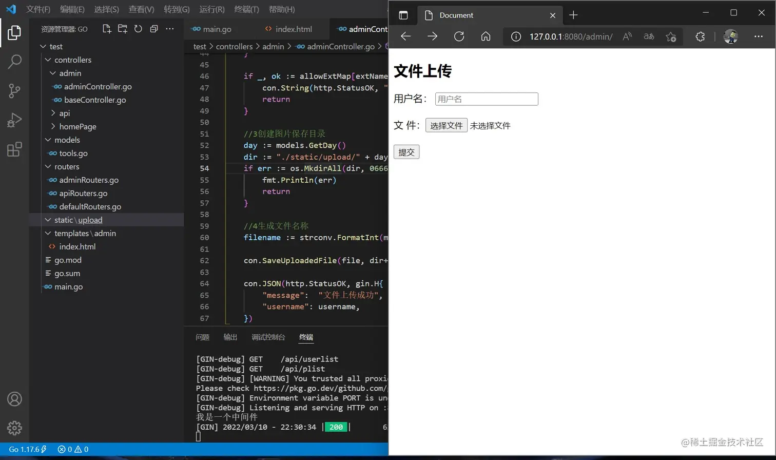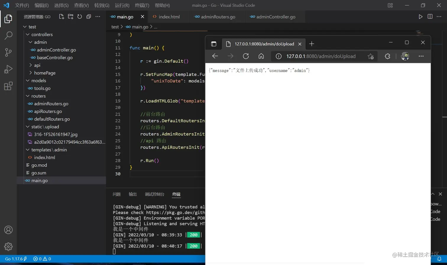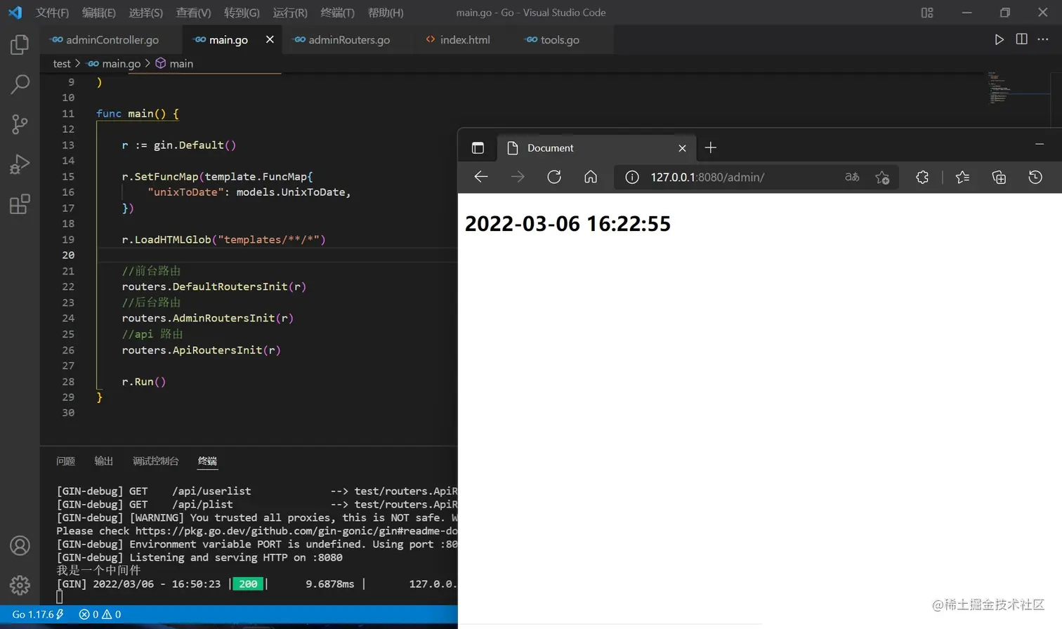 回到 main.go ,加载模板的语句要变化,使用两个星号表示一层目录,并分别配置前后端路由