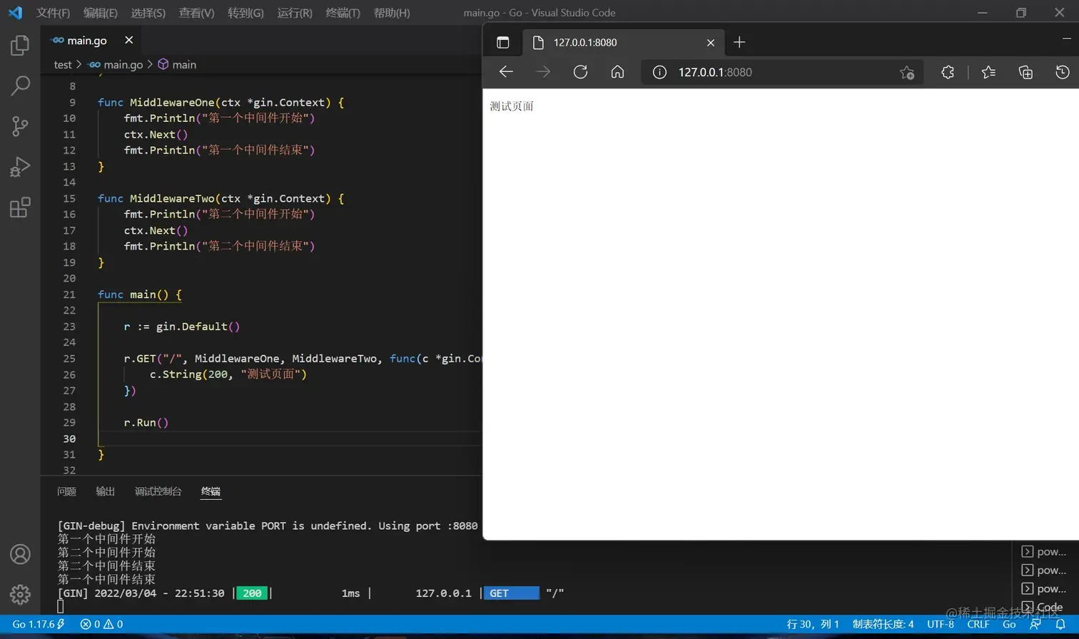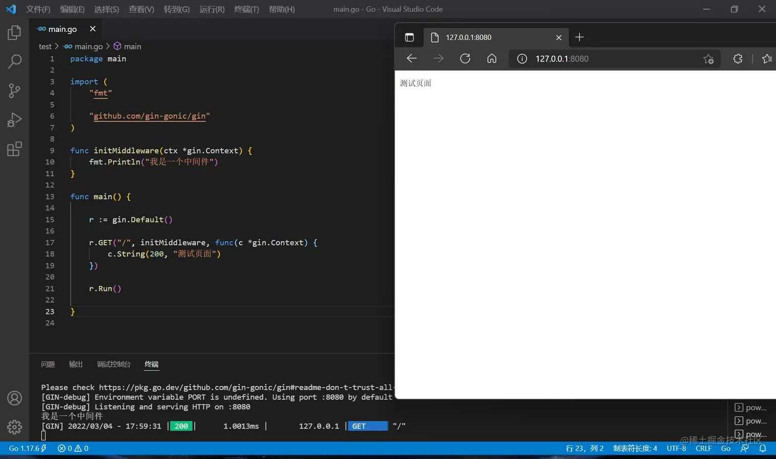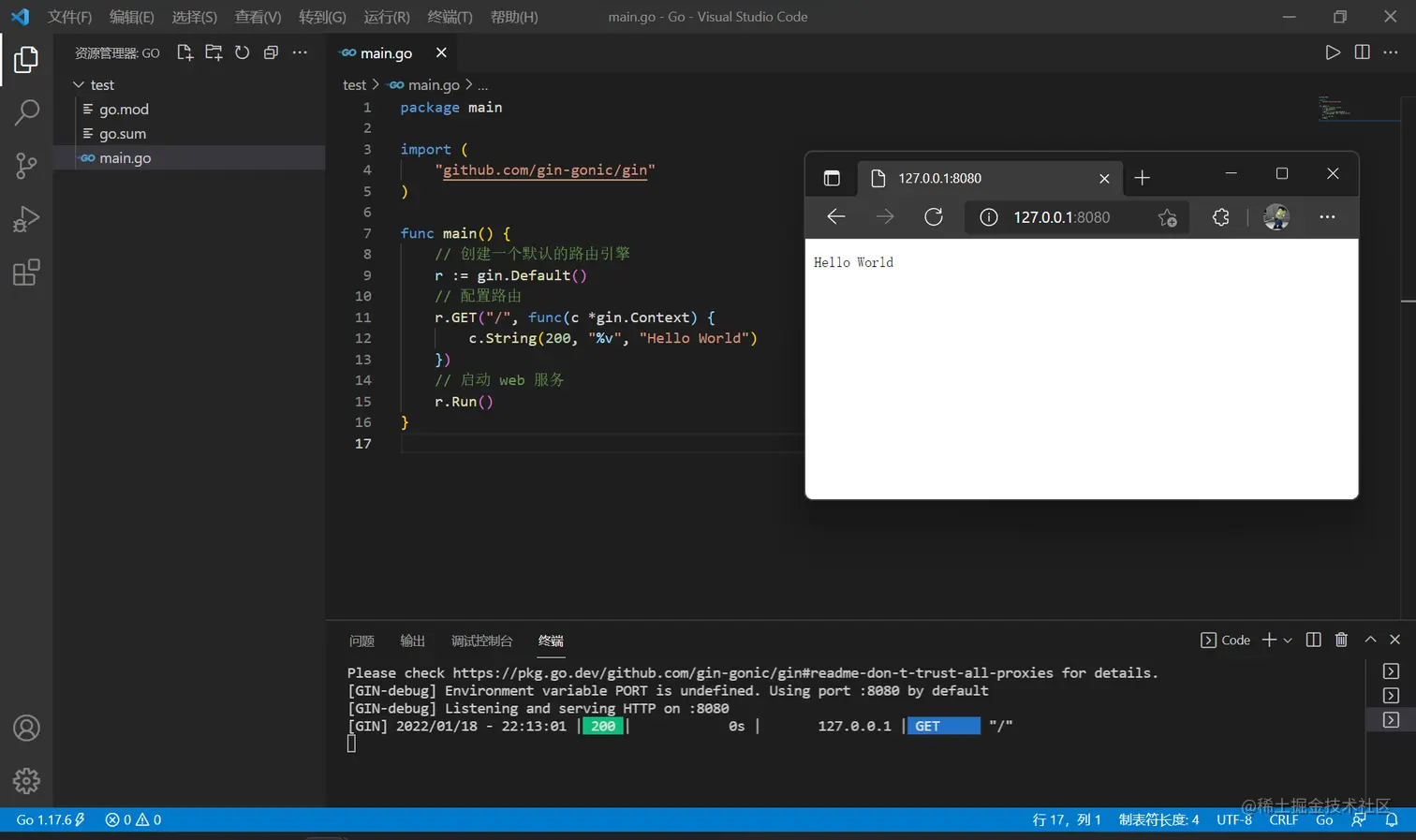 使用go run main.go运行,访问本机的 8080 端口能看见 Hello World