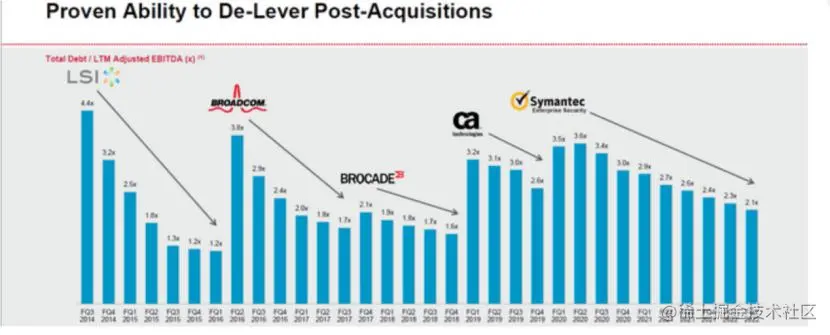 此外,博通还分别与控制 VMware 40.2% 股份的 Michael Dell 和占其 10% 股份的银湖资本(Silver Lake)签订了 " 价高者得 " 的协议,即在 7 月 5 日之前若有出价更高的买主,双方可以一拍即散。但时至六月份,无论是有志于进军软件领域的英特尔,还是同类型的亚马逊、谷歌都毫无意愿收购 VMware,所以,这则交易的 " 财务协同 " 的落地在博通发起收购的那一刻起,就已经完全上路了,即博通承诺 VMware 在收购完成之后的三年内,将 VMware 的 EBITDA 从本财年的 47 亿美元跃升至 85 亿美元。专注半导体企业股市走向的华尔街分析师 Stephen Simpson 指出,博通为达到这一目标,其优势在于业务运营、压缩成本和优化现金流,而非突破性的产品研发,从过去的历史来看,博通依靠强劲的现金流,总能在大型收购后快速降低杠杆率。