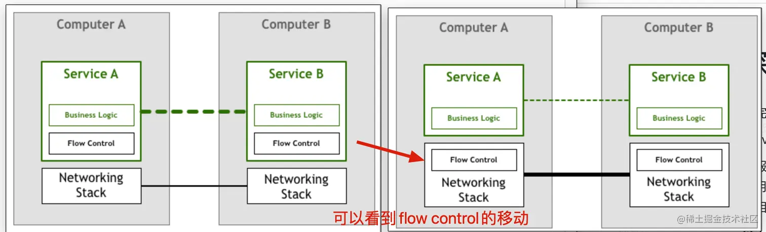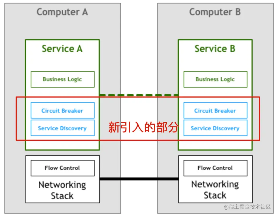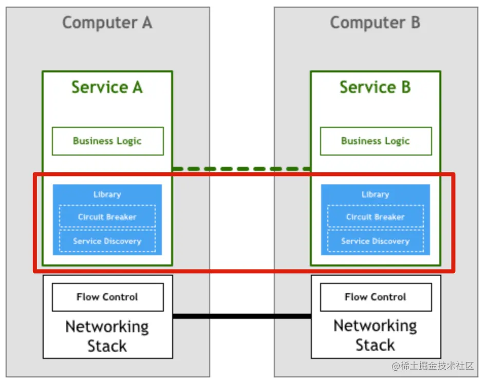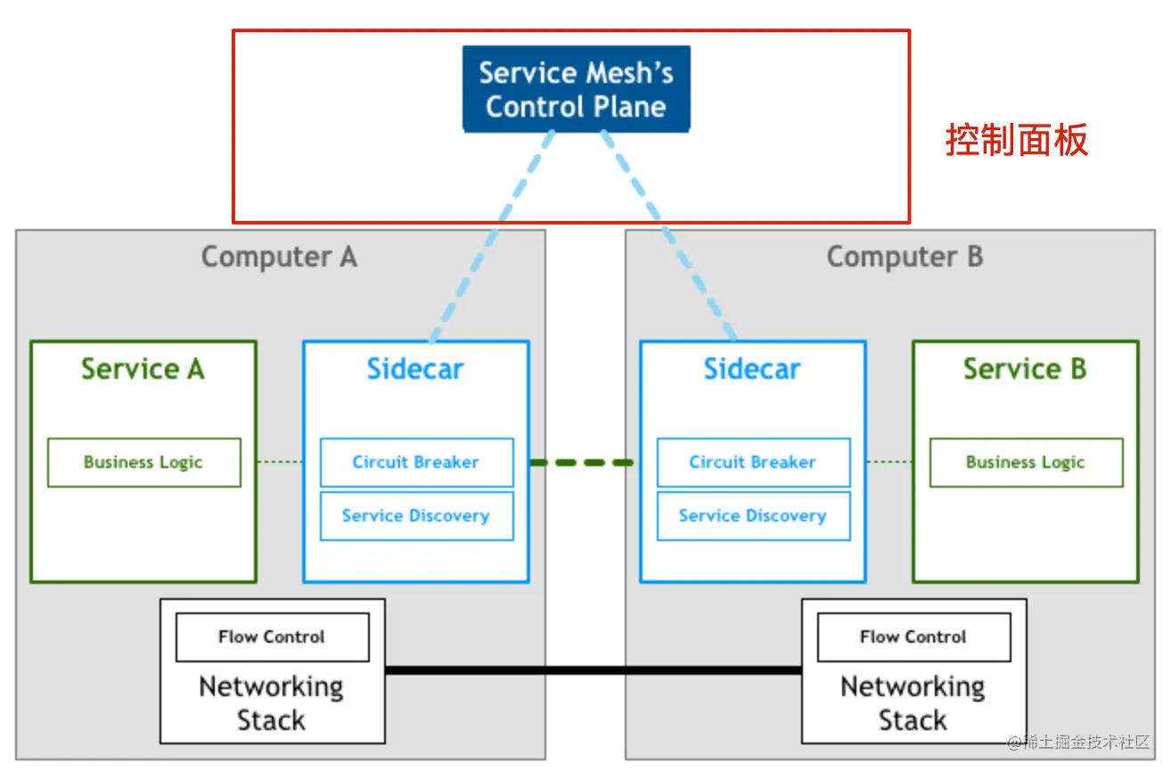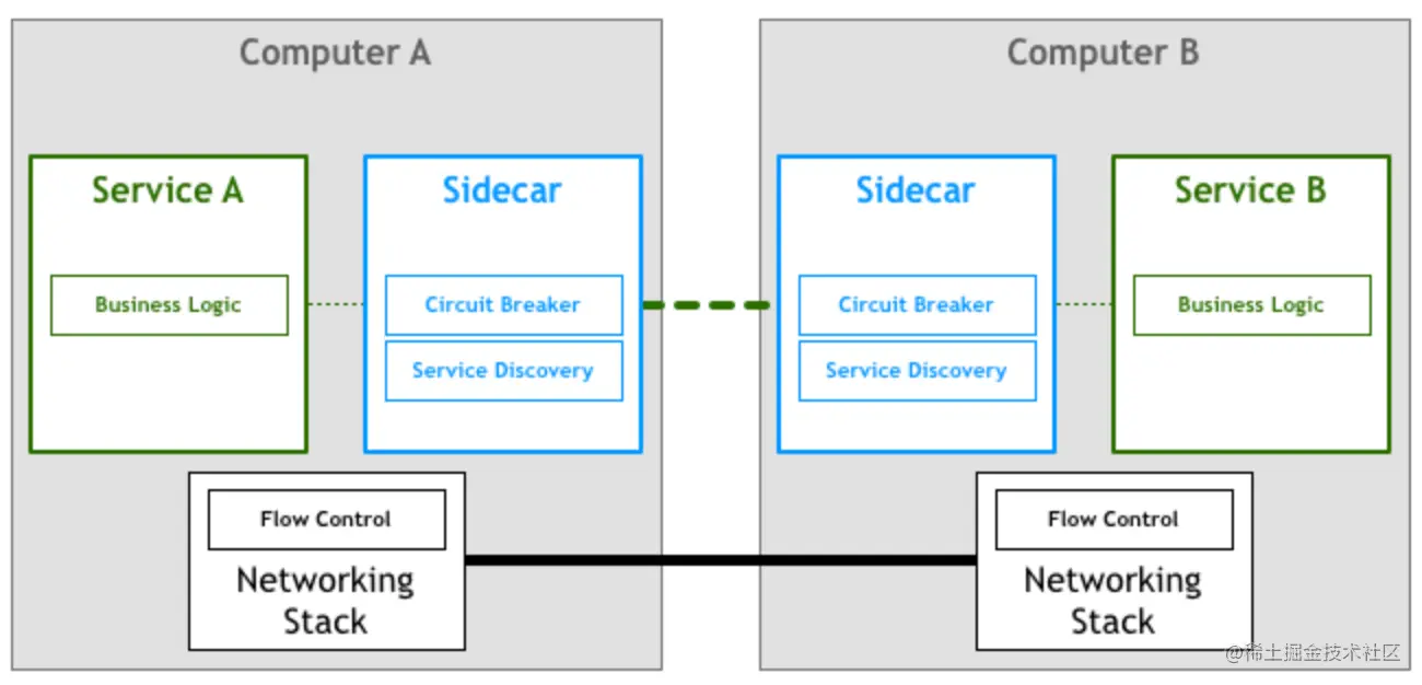 分布式服务通信抽象为单独一层,在这一层中实现负载均衡、服务发现、认证授权、监控追踪、流量控制等分布式系统所需要的功能,作为一个和服务对等的代理服务,和服务部署在一起,接管服务的流量,通过代理之间的通信间接完成服务之间的通信请求,这样上边所说的三个问题也迎刃而解。