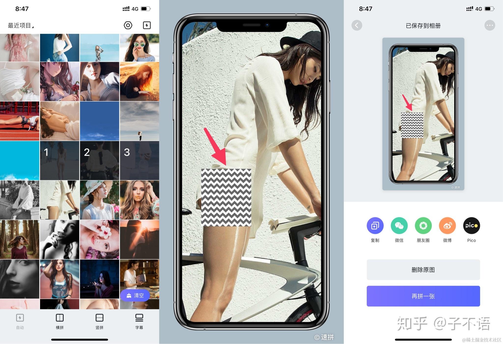 - 各项操作之间衔接紧密,不需要反复跳出,可以通过「再来一张」这个选项一直拼下去。