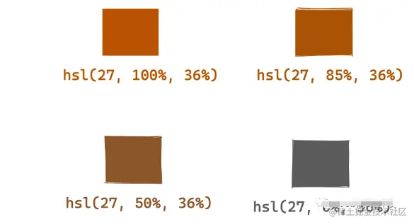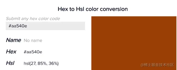 棕色为#aa540e,用HSL颜色表示为hsl(27, 50%, 36%),如下: