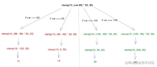 这个要求和clamp函数类似,但又不一样。clamp可以将 var 的值限制在一个范围内,但我们现在希望结果的值是 10 或 20。