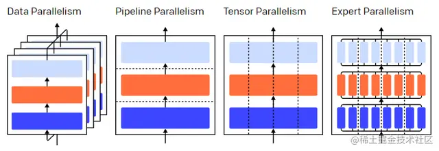 不同的并行技术将训练过程划分为不同的维度,包括: