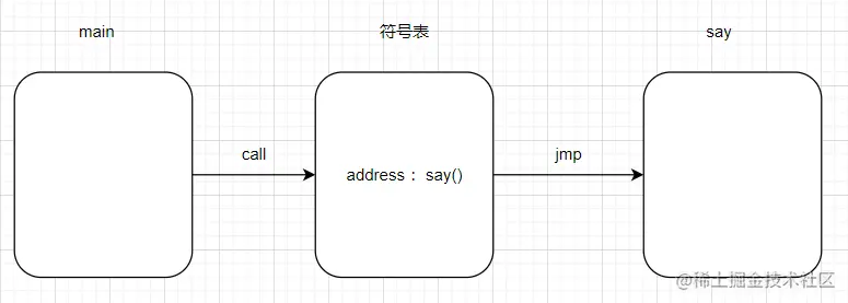 要想寻找答案,需要了解一点点底层知识,那就是编译器在编译 C 方法时会将 函数名 作为符号添加到 符号表 中,这个 符号表 就是 call 到 say方法字节码 中间的一个载体,画个图大概就是这样。