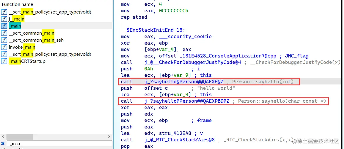 从汇编代码看, 调的都是 Person::sayhello 这个符号,奇怪的是他们属于不同的地址: 03B13A2h, 03B1302h,这就太奇怪了,哈哈,字典类符号表 肯定是没有问题的,问题是 Visual Studio 20222 的反汇编窗口在调试时做了一些内部转换,算是蒙蔽了我们双眼吧,