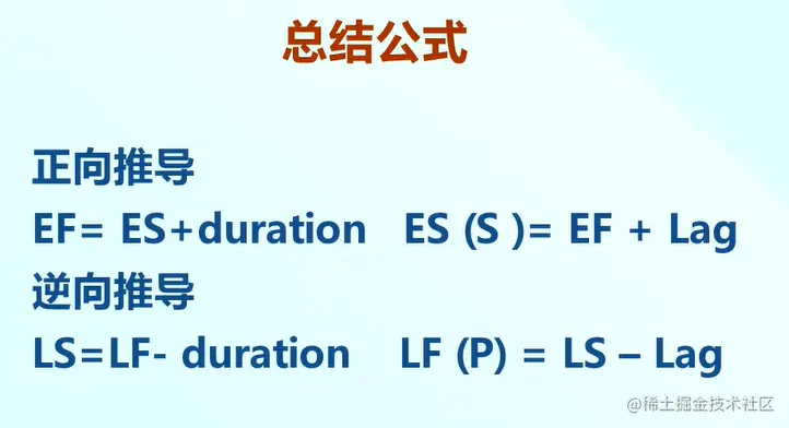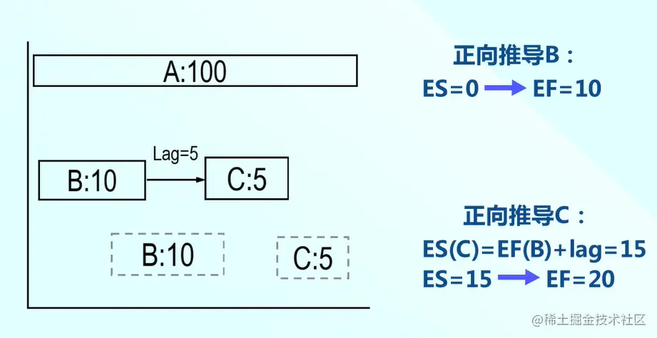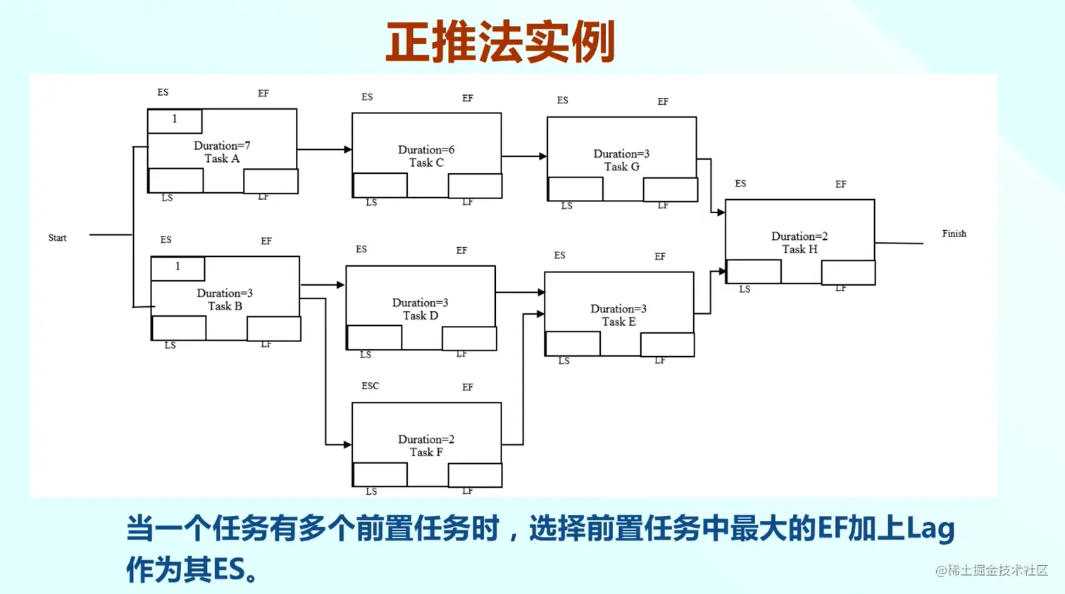 - EF+Lag=ES(s),当一个任务有多个前置任务时,选择前置任务中最大的EF加上Lag作为其ES。