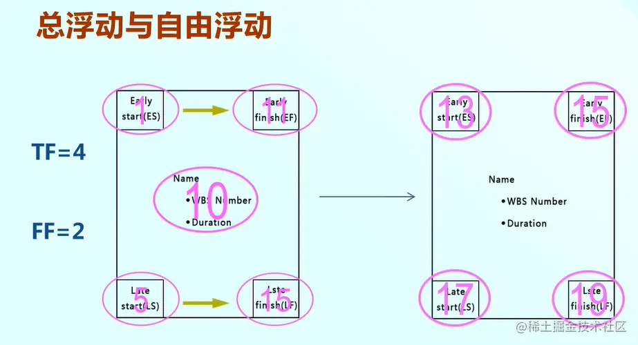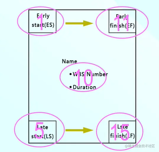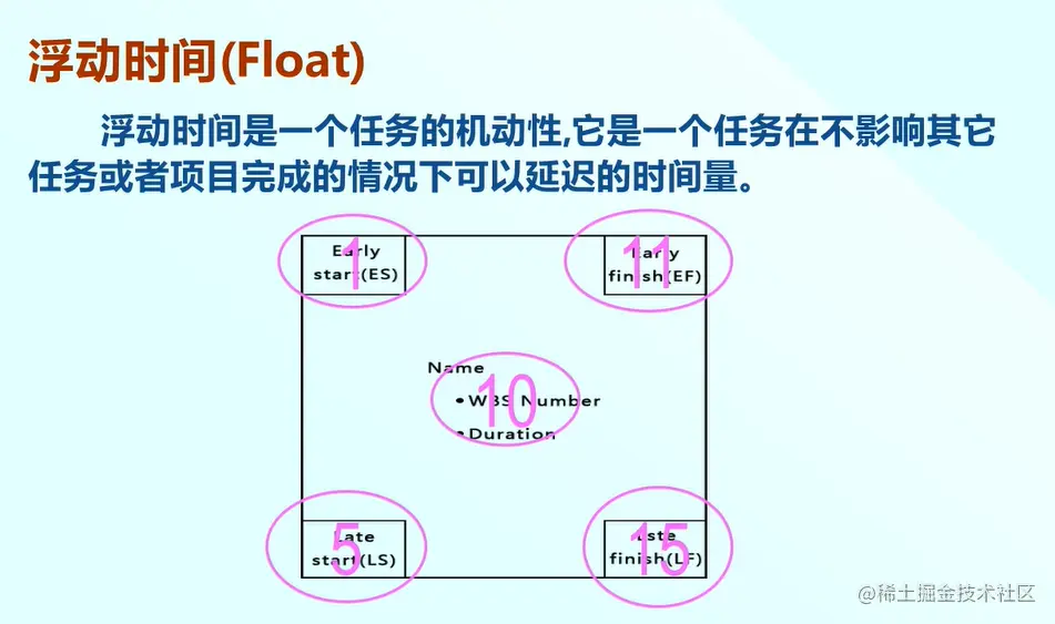例如:我们看这个任务是10天,最早开始时间ES=1,最早完成时间EF=11,最晚开始时间LS=5,那么对应最晚完成时间LF=15。