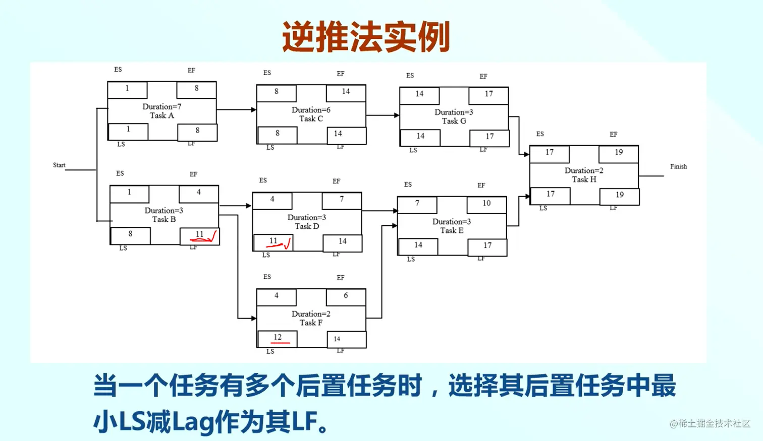 图中任务B有两个后置任务,则需要选择后置任务中最小的LS减去Lag作为其LF,所以选择任务D的LS=11,因为没有Lag,所以任务B的LF=11.