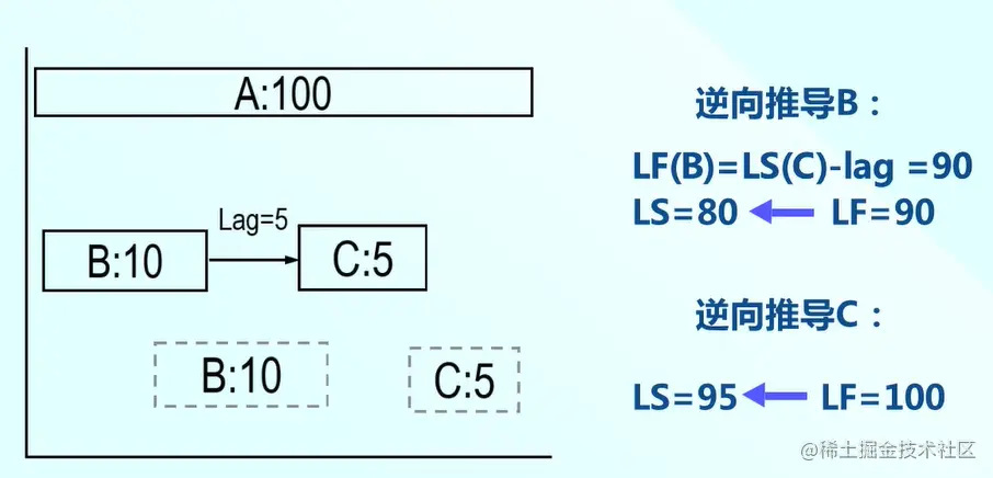 B的LF=LS©-Lag(5)=90.则B的LS(最早开始时间)=LF(90)减去历时10天为80。