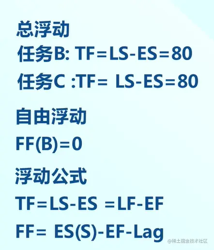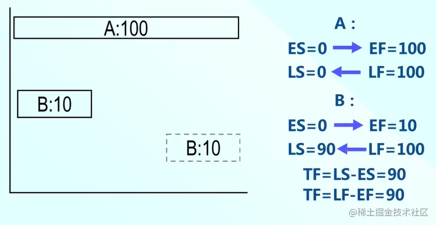 接下来说浮动,刚才说了B有浮动,很明显看出来有90天浮动,那么这个浮动是总浮动,TF=LS-ES=90,或者TF=LF-EF=90。