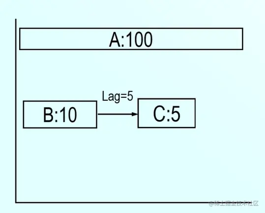 现在在任务B的后面加一个任务C,任务C的历时是5,并且B和C之间加一个延迟Lag,这个Lag=5,既B任务完成5天后,C这个任务才能开始。