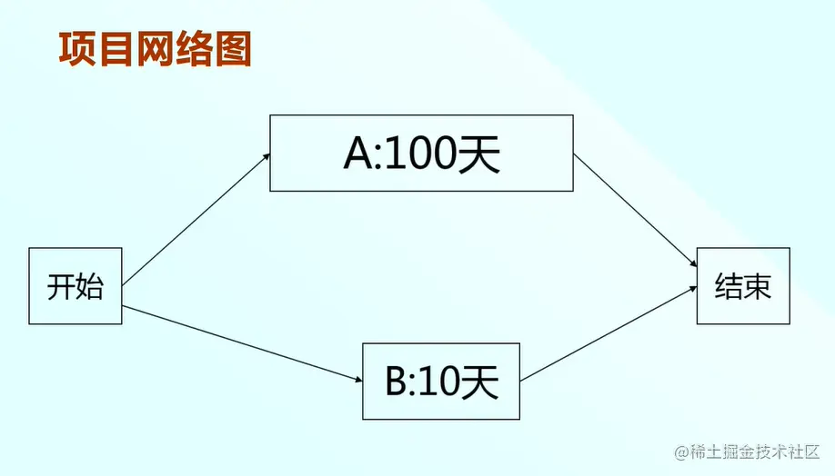 我们看一个项目网络图:关键路径是A,项目完成的时间是100天。